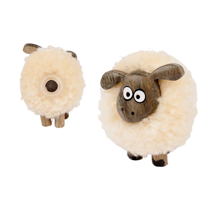Sheep-shaped magnet made from wood with a cream-colored fleece pom pom body, black and white eyes, and black hooves. Magnet attached on the back.